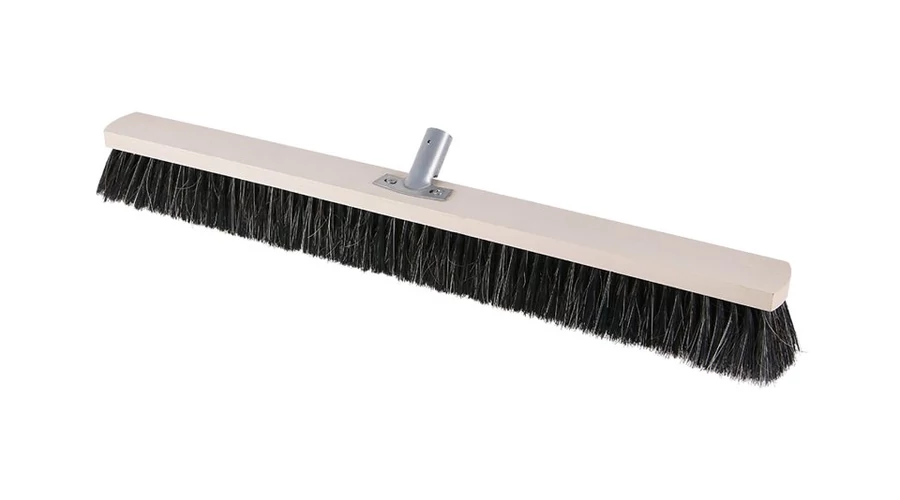 Klasszikus fa csarnokseprű fém tartóval, menet nélküli nyélhez. PET/gumi szálak.