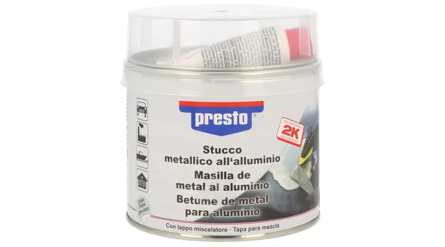 A Presto Alumínium Gitt „sztiroltartalmú” kétkomponensű poliészter töltőgitt, amely környezetbarát ásványi töltőanyagokkal és alumíniumpigmentekkel gazdagított összetétellel készül. Ideális töltőanyag autójavításhoz, motorépítéshez és különféle hobbi munkákhoz. Kifejezetten ajánlott olyan felületekre, ahol nagy kiterjedésű rétegfelhordásra van szükség, és fontos a tartós, jól csiszolható alap kialakítása.