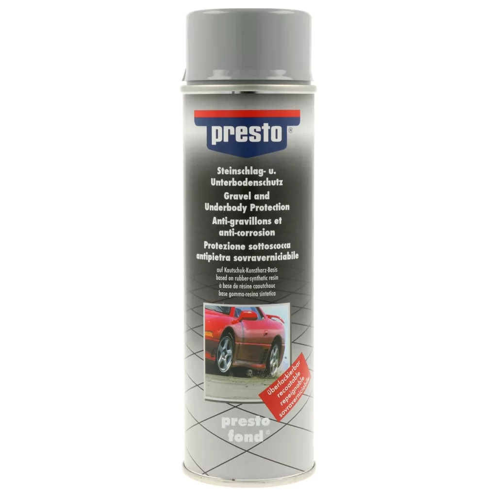 A Presto kavics felverődés elleni alvázvédő Ideális kőfelverődés- és korrózióvédelem bármely gépjármű alvázára. Átfesthető, így különösen jól alkalmazható a látható területeken. Kemény, ugyanakkor rugalmas bevonatot képez, amely védelmet nyújt a kőfelverődések ellen. Kiválóan ellenáll az időjárás viszontagságainak, a fröccsenő víznek és a kopásnak, valamint gyenge savaknak és bázisoknak is.