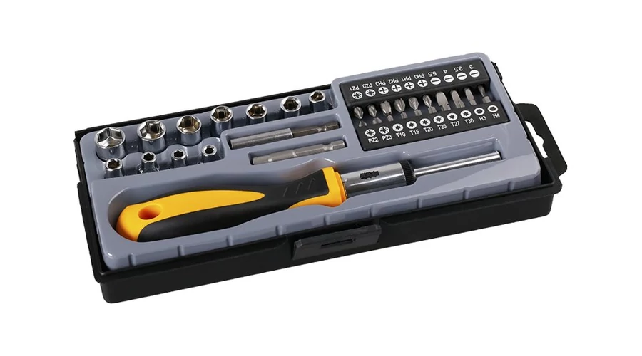 Racsnis csavarhúzó készlet bitekkel és adapterekkel, CrV acélból, 36 részes