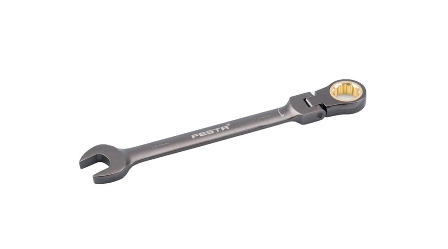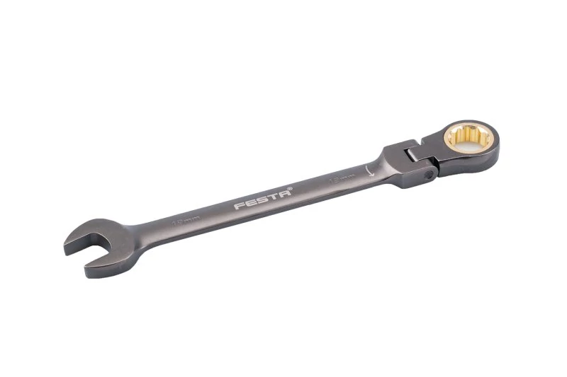 A FESTA racsnis villáskulcsok szögben használható csuklóval a racsnis (racsnis) előnyével minőségi króm-vanádium acél vasalatokból készülnek. Ez az acél felülete matt kemény krómmal van kezelve az optimális felületi keménység és a korrozív hatásokkal szembeni ellenállás elérése érdekében. A villáskulcs racsnija 72 edzett fogból áll, 5 ívfokban kapcsolva. Minőség, keménység és pontosság tekintetében pontosan megfelelnek a DIN/ISO szabványnak.