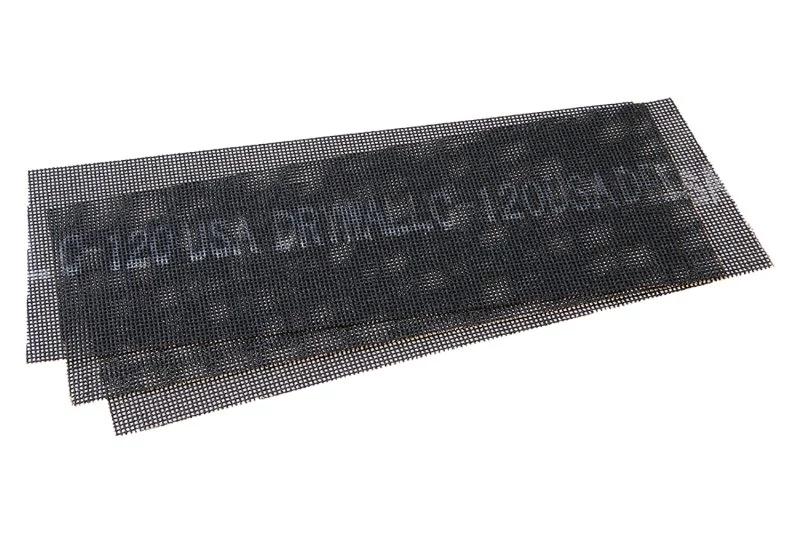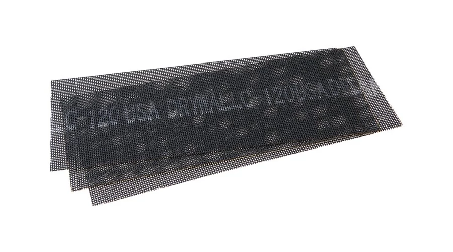 Csiszolóracs 115 x 290 mm, szemcseméret 120, 3 db/szett euro furattal, üvegszálas hordozószövet, gyantával ragasztott szilícium-karbid csiszolószemcsék antisztatikus bevonattal, alkalmas gipszkarton fugakeverékek és egyéb anyagok csiszolására, előnye a rácsszerkezet a közönséges csiszolópapírokhoz képest annyiban van, hogy nincs eltömődve őrölt anyaggal.