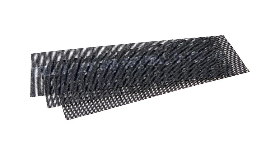 Csiszolőrács 93 x 290 mm, szemcseméret 120, 10 db/szett, üvegszálas hordozószövet, gyantakötésű szilícium-karbid csiszolószemcsék antisztatikus bevonattal, alkalmas gipszkarton fugakeverékek és egyéb anyagok csiszolására, a rácsszerkezet előnye a hagyományos csiszolópapírokhoz képest az, hogy nem tömődik el a darált anyaggal.