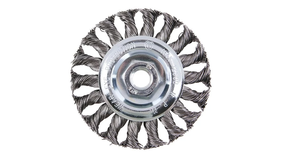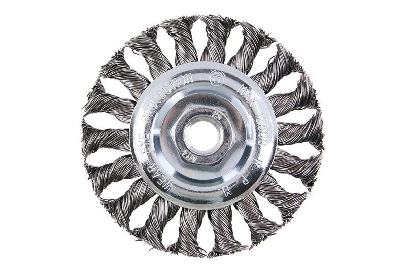Forgókefe - radiális, kivitel: COPY - szabadalmaztatott huzal 0,5 mm - másolás, extrém terhelés mellett sem bomlik ki, a FESTA kefék garantálják a minőségi felhasznált anyagokat és megmunkálást, átmérő 100 mm Menet M14x2mm Horganyzott kefetest Huzalok száma: 1584, Huzal hossza: 27mm max. megengedett fordulatok: 10000 1/min Felhasználás: festék, rozsda, sorja, hegesztési maradványok, salak eltávolítása, érdesítés, fémtisztítás..., csomagolás: papírdoboz eurolyukkal.