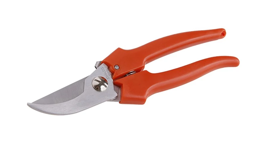 Rozsdamentes acél kerti olló műanyag ergonómikus formájú nyéllel, hossza 190 mm, félkör alakú penge, felhasználás: kerti és háztartási munkák.