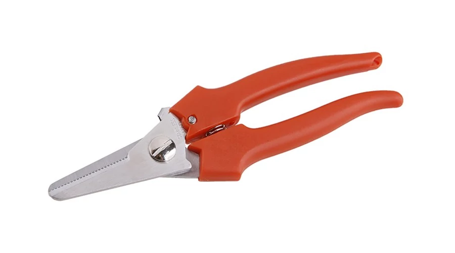 Rozsdamentes acél kerti olló műanyag ergonómikus formájú nyéllel, hossza 190 mm, egyenes pengével, felhasználása: kerti és háztartási munkák.