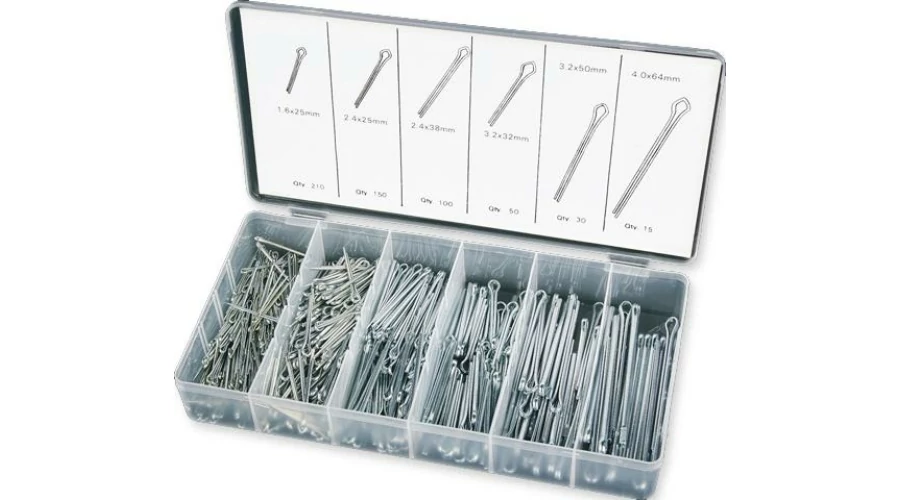 555 darabos biztosítószeg készlet műanyag fakkos dobozban. 6 különböző méret van a dobozban. Anyaga acéllemez krómozott kivitelezésben.