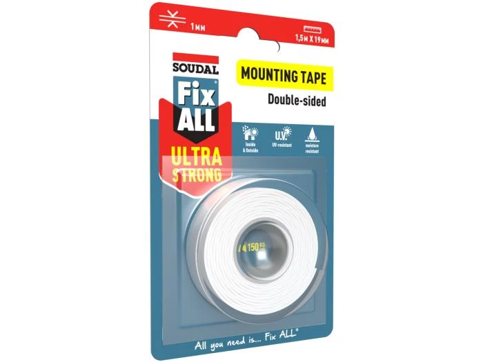 Ultraerős kétoldalú ragasztószalag. Ideális különféle anyagok gyors, könnyű és tartós ragasztására és felszerelésére. Például tükör, üveg, csempe, kő, acél, a legtöbb fajta fém, furnér, bevonatos fa és a legtöbb műanyag esetén. A Fix ALL Ultraerős Ragasztószalag hosszútávú és tartós ragasztást biztosít a felületeken és kültéren és beltéren is használható.