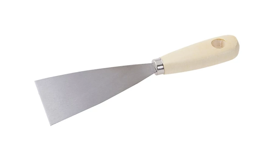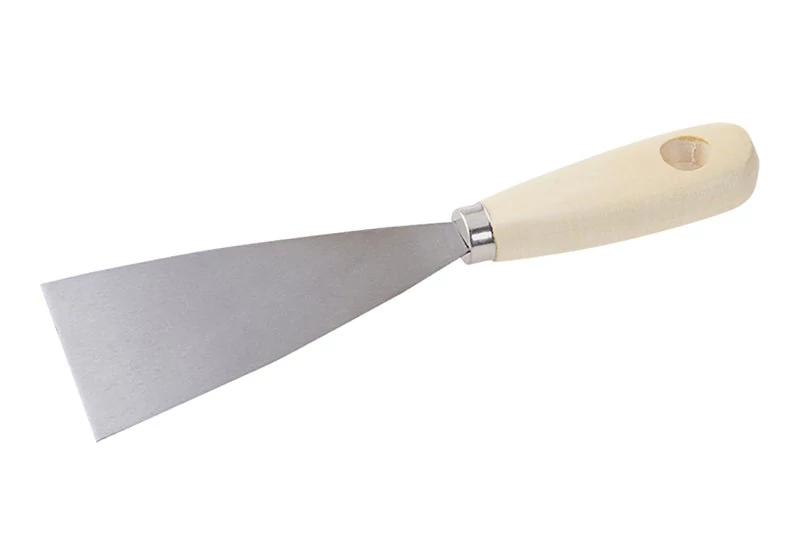 Acél spatula 60 mm, fa nyéllel. A spatula építési vakolat, tömítőanyagok felhordására és kiterítésére vagy régi tömítőanyagok, festmények vagy tapéták tisztítására és eltávolítására szolgál. A háromszög alakú formának köszönhetően az anyag nagyon könnyen felhordható és eltávolítható.