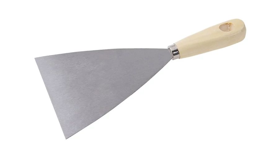 Acél spatula 125 mm, fa nyéllel. A spatula építési vakolat, tömítőanyagok felhordására és kiterítésére vagy régi tömítőanyagok, festmények vagy tapéták tisztítására és eltávolítására szolgál. A háromszög alakú formának köszönhetően az anyag nagyon könnyen felhordható és eltávolítható.