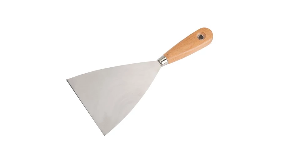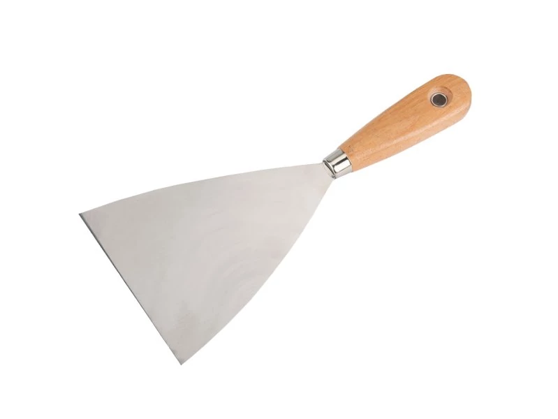 FESTA rozsdamentes acél ék spatula 100 mm fa nyéllel. Használható vakolásnál, festésnél, festésnél, karosszériajavításnál vagy művészi alkotásnál, stb. Alkalmas vakolat vagy egyéb tömítőanyag felhordására vagy régi festékek és bevonatok eltávolítására.