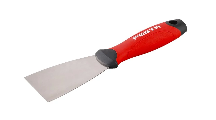 FESTA 60 mm-es rozsdamentes acél spatula ergonomikusan kialakított guminyéllel. Használható vakolásnál, festésnél, festésnél, karosszériajavításnál vagy művészi alkotásnál, stb. Alkalmas vakolat vagy egyéb tömítőanyag felhordására vagy régi festékek és bevonatok eltávolítására.