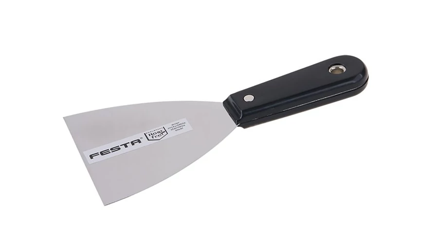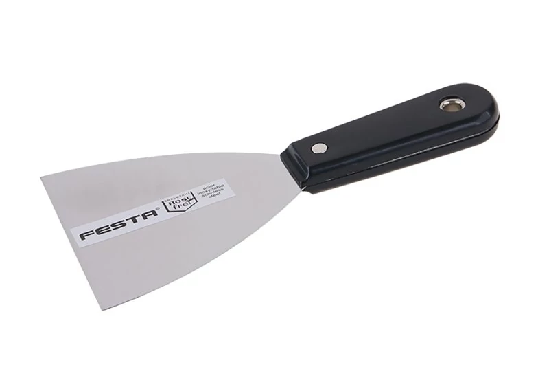 Rozsdamentes acél spatula FESTA 100 mm műanyag nyéllel. Használható vakolásnál, festésnél, festésnél, karosszériajavításnál vagy művészi alkotásnál, stb. Alkalmas vakolat vagy egyéb tömítőanyag felhordására vagy régi festékek és bevonatok eltávolítására.