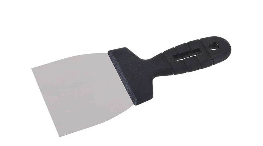 Rozsdamentes acél kaparó spatula 100 mm műanyag nyéllel. Használható vakoláshoz, festéshez, festéshez, karosszériajavításhoz vagy művészi alkotáshoz, stb. Alkalmas régi festések és bevonatok eltávolítására.
