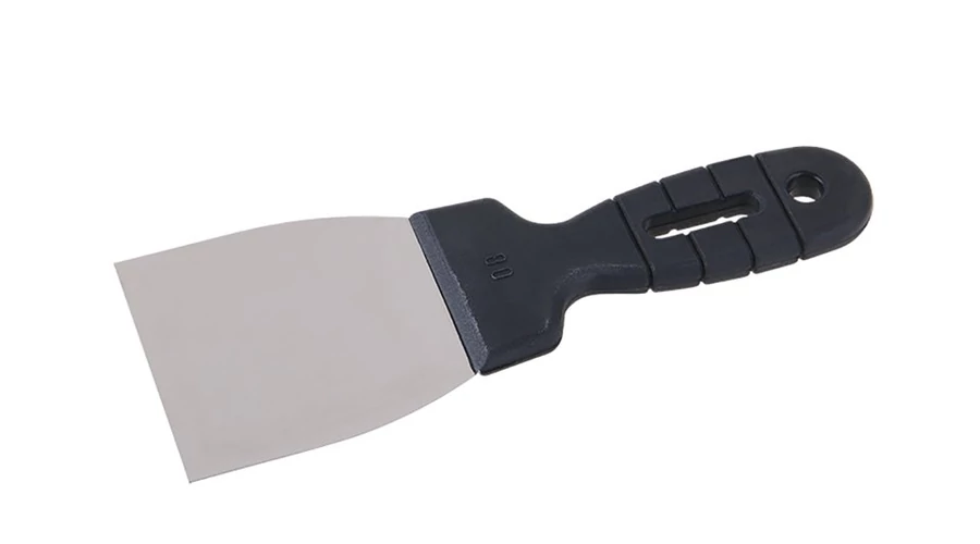Rozsdamentes acél kaparó spatula 80 mm műanyag nyéllel. Használható vakoláshoz, festéshez, festéshez, karosszériajavításhoz vagy művészi alkotáshoz, stb. Alkalmas régi festések és bevonatok eltávolítására.