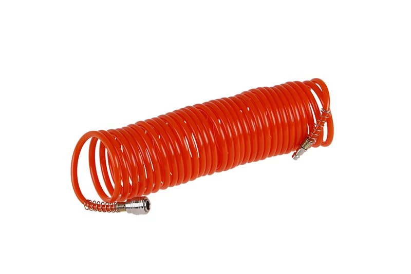 Spirális nyomótömlők gyorscsatlakozókkal, működik nyomás 8-9bar, szabad légnyomás 25bar-ig.