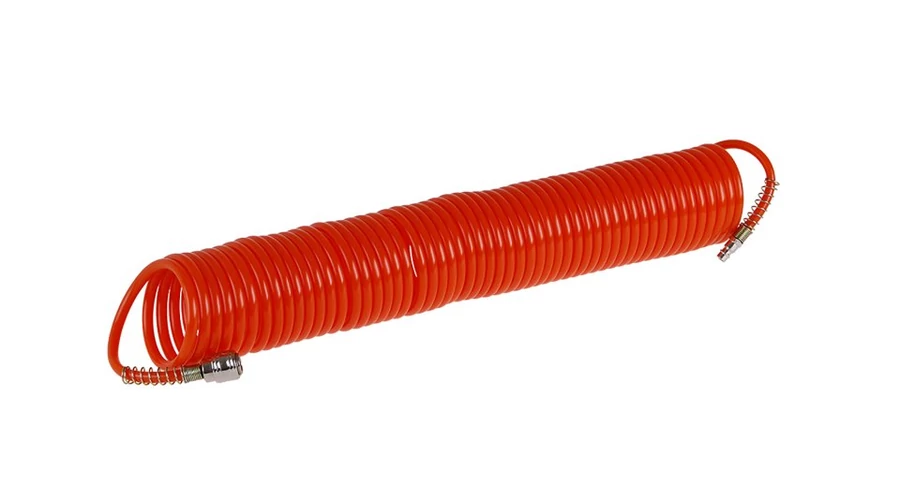 Spirális nyomótömlők gyorscsatlakozókkal, működik nyomás 8-9bar, szabad légnyomás 25bar-ig.