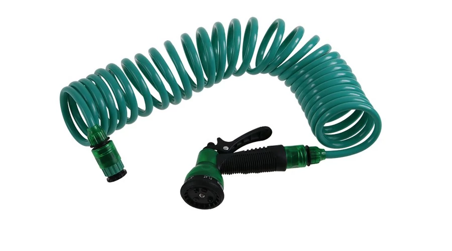 Spirális tömlő 7,5m szett, a visszatérő erő miatt a spiráltömlő használat után automatikusan visszahúzódik, a készlet tartalma: gyorscsatlakozóval és stop csatlakozóval felszerelt tömlő, impulzuszuhany.