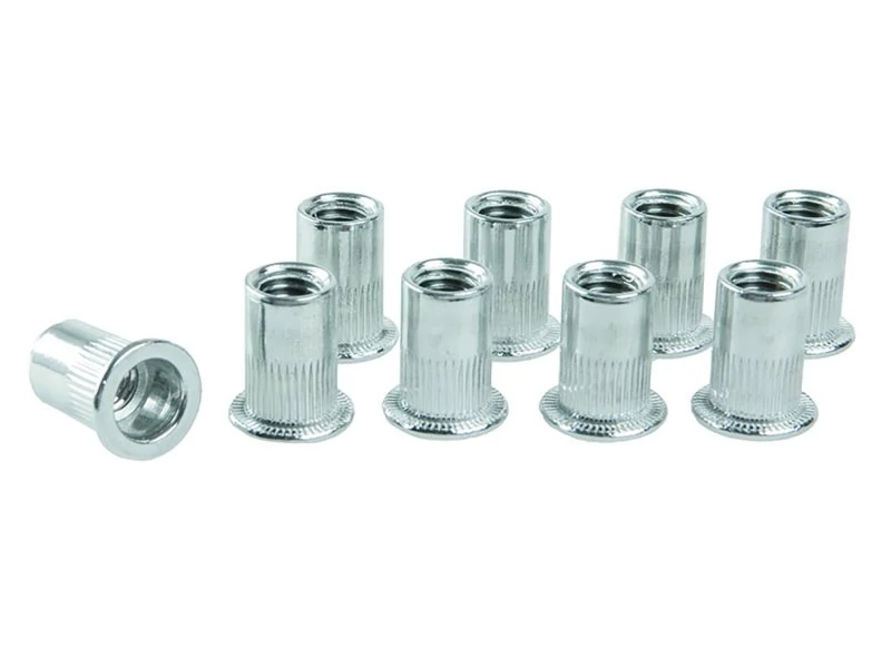 Alumínium szegecs anya M4 metrikus menettel, hossz 11 mm, darabszám a csomagban 20 db, recézett gallér a csatlakozás nagyobb szilárdsága érdekében. Alkalmazása - FESTA szegecselő fogóval, szám: 24035.