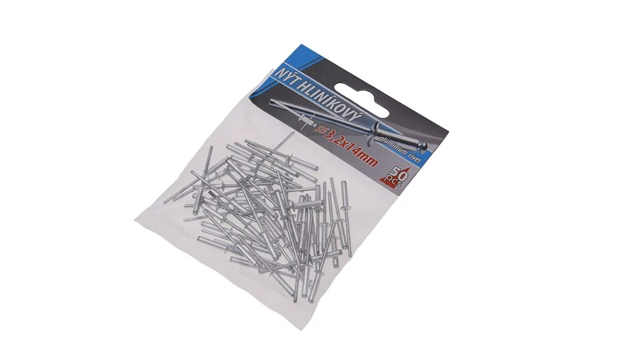 Klasszikus redőny-alumínium szegecsek, átmérő 3,2 mm, hossza 14 mm, 50 db-os kis kiszerelésben, kisfogyasztóknak megfelelő.