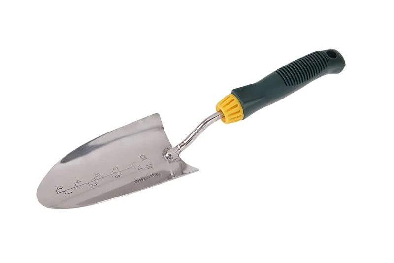 Kerti ásó ROSA - rozsdamentes acél, széles, praktikus mérő az ültetéskor a megfelelő mélység egyszerű eléréséhez, minőségi anyag és kidolgozás, ergonomikus műanyag nyél, hossza 36 cm, felhasználás: minden kerti munkához, szobanövényekkel való munkához... , csomagolás: buborékfólia Eurolyukkal.
