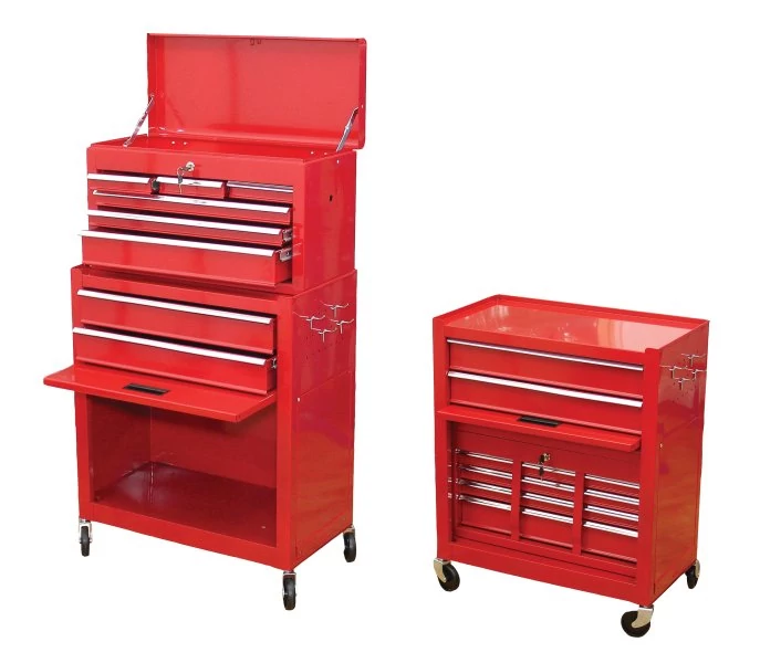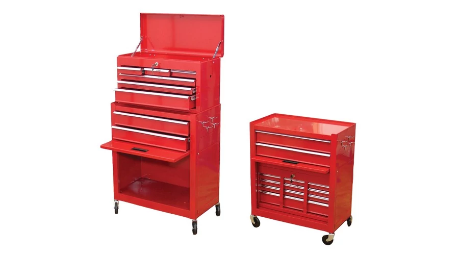 Magas, két részből álló szerelőkocsi, a felső szekrény az alsó kocsiban tárolható. FELSŐ DOBOZ: Teljes méretek: 600x260x340mm 3x alacsony fiók: 151,5x225x40mm 2x széles alacsony fiók: 511x225x40mm 1x magas fiók: 511x225x85mm Súly 11,2kg. ALSÓ DOBOZ: Teljes méretek: kerekek nélkül 616x330x658mm, kerekekkel 616x330x742mm 2x fiók: 511x308x85mm tároló rész: 536x300x378mm FORGÓKEREKEK: átmérő 76,2mm szélesség 25,4mm