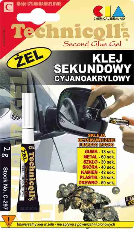 Second Glue Gel Színtelen, tixotróp tulajdonságú, gél állagú ciánakril ragasztó, amely ellenáll a vibrációs terhelésnek. Nem folyik le a függőleges felületekről. Pár másodperc alatt minden anyagot összeragaszt: üveget, fát, fémeket, követ, gumit és különböző műanyagokat. (Kivéve PP, PE, PTFE).
