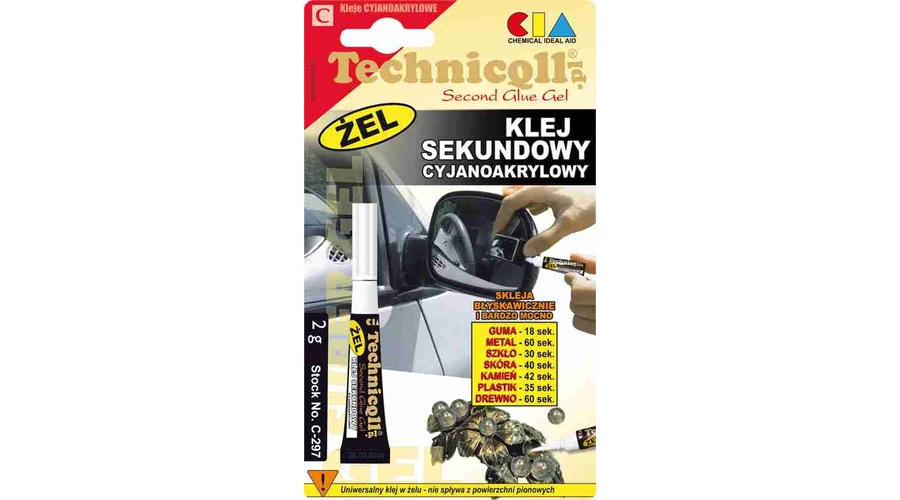 Second Glue Gel Színtelen, tixotróp tulajdonságú, gél állagú ciánakril ragasztó, amely ellenáll a vibrációs terhelésnek. Nem folyik le a függőleges felületekről. Pár másodperc alatt minden anyagot összeragaszt: üveget, fát, fémeket, követ, gumit és különböző műanyagokat. (Kivéve PP, PE, PTFE).