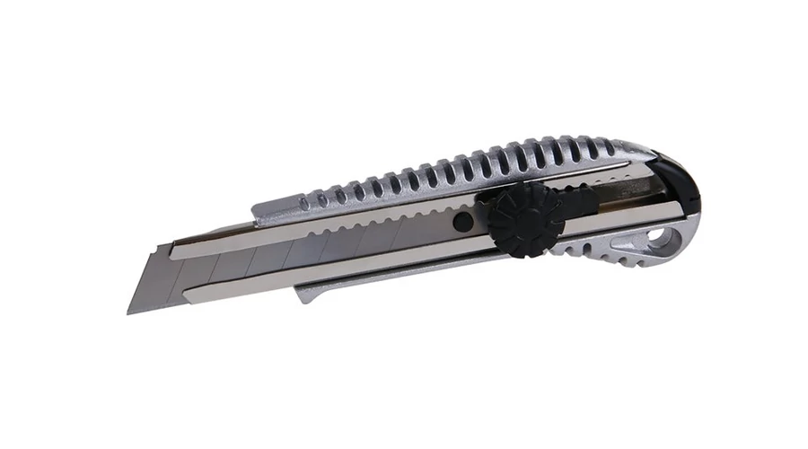 Letörő kés, fém test, csúszásgátló hornyok, acél vezetősín, csavaros zár, 18mm.
