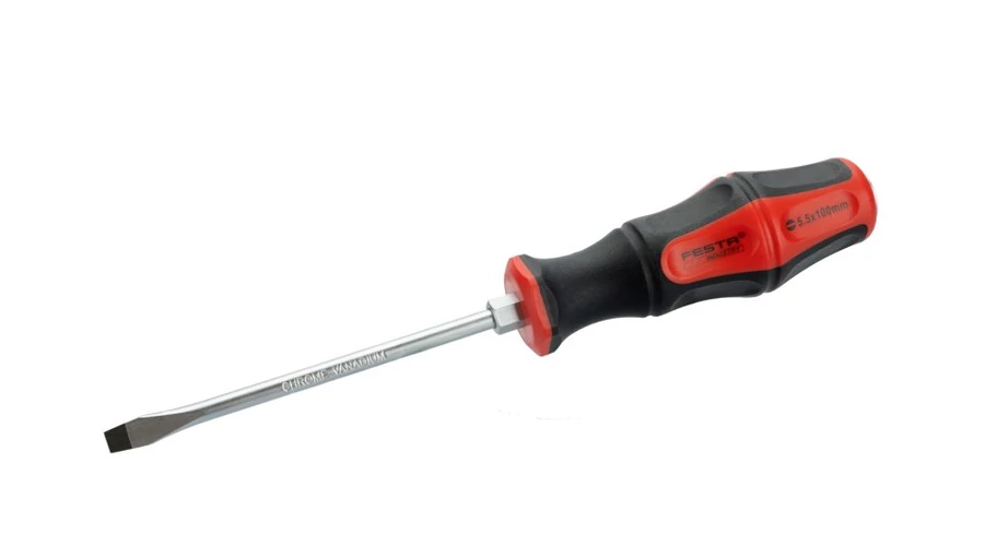 A FESTA csavarhúzó fém szára kiváló minőségű króm-vanádium acélból készült, edzett hegye mágneses, a fogantyú hatszögletű a kulcs használatához, a markolat polipropilén és gumi kombinációja és ergonomikus formája garantálja a jó anti- csúszási tulajdonságok és jó kenőanyagokkal és vegyszerekkel szembeni ellenállás.