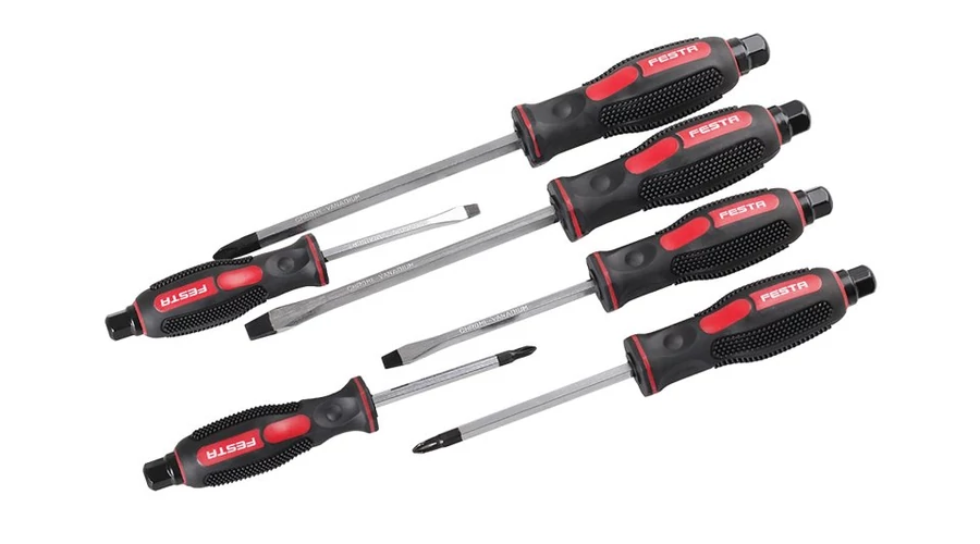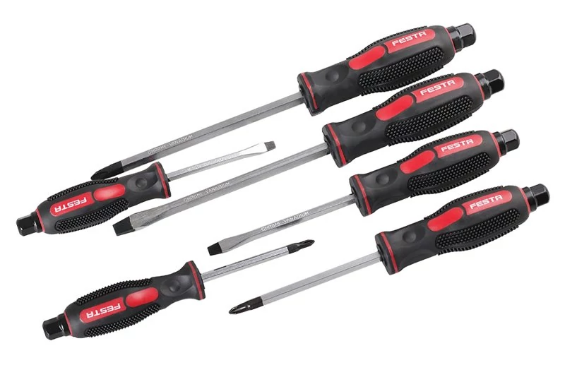Ütőcsavarhúzó készlet CrV 6 db. A készlet tartalma: 3x lapos csavarhúzó (5, 6, 8 mm), 3x Phillips csavarhúzó (1, 2, 3 mm). A hatlapfejű tengelynek a teljes fogantyún áthaladó vége kalapács ütőfelületeként használható, vagy csavarkulccsal vagy dugókulcs racsnival meglazítható és meghúzható. Precíziós marású mágneses hegy.