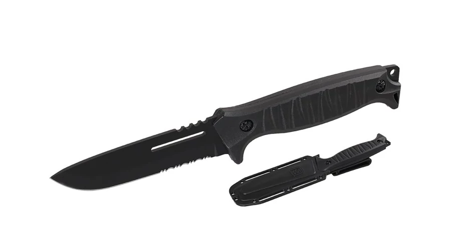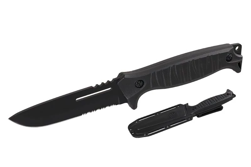 - műanyag tok biztonsági berendezéssel a kés kiesése ellen, övcsipesszel és hátizsákhoz rögzíthető lyukakkal