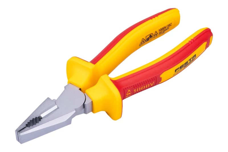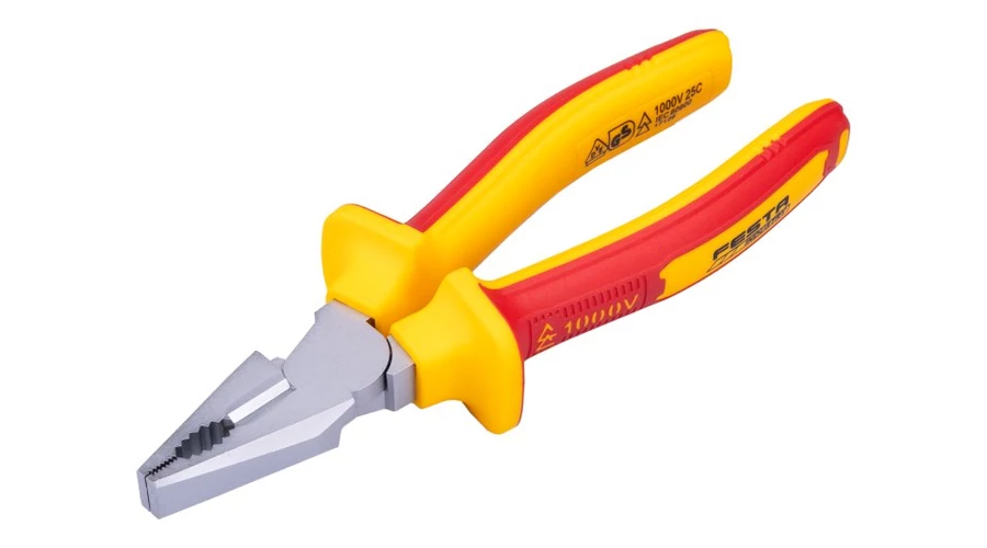 A VDE kombinált 180 mm-es FESTA fogók elektro VDE 1000 V, IEC/EN 60900-2004 tanúsítvánnyal rendelkeznek, a polipropilén és a gumi kombinációja az ergonomikusan kialakított fogantyúkon kiváló csúszásgátló tulajdonságokat és jó kenőanyagokkal és vegyszerekkel szembeni ellenállást garantál. Megfogópofák különösen kopásálló, króm-vanádium nagy teljesítményű acélból. Súlya 0,333 kg.