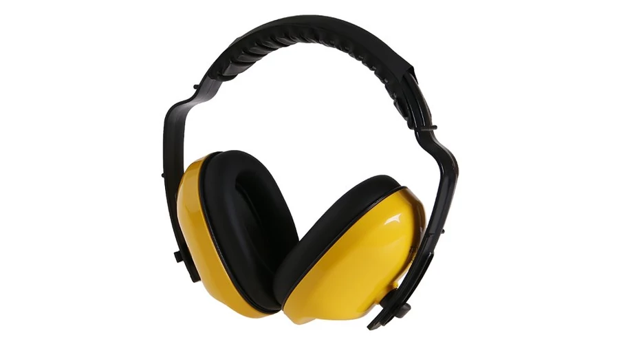 Sárga védőfejhallgató ABS anyagból, PVC párnák, puha összekötő ív, állítható hosszúság, 27 dB, CE EN 352-1.