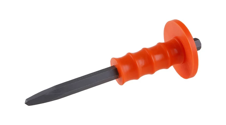 Véső (majzlík, majzl) hegyes műanyag védelemmel. Króm-vanádium anyag. Alkalmas kő, tégla, építőanyag megmunkálására.