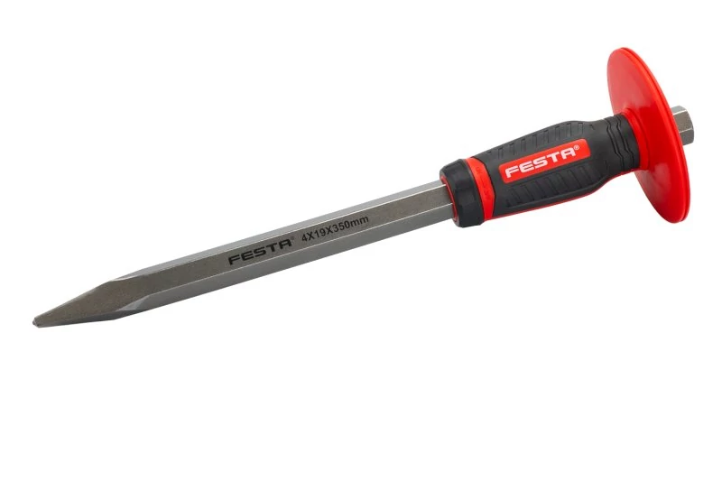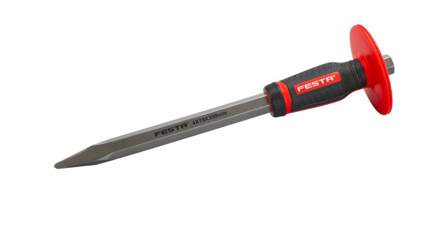Véső (majzlík, majzl) hegyes műanyag védelemmel. Króm-vanádium anyag. Alkalmas kő, tégla, építőanyag megmunkálására.