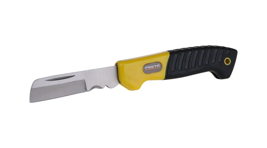 Záró villanyszerelő kés egyenes pengével, erős penge dupla éllel a vezetékek csupaszítását megkönnyíti, gumírozott ergonomikus nyél, buborékfólia.