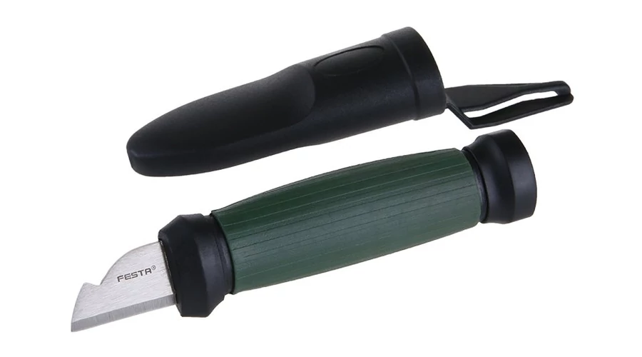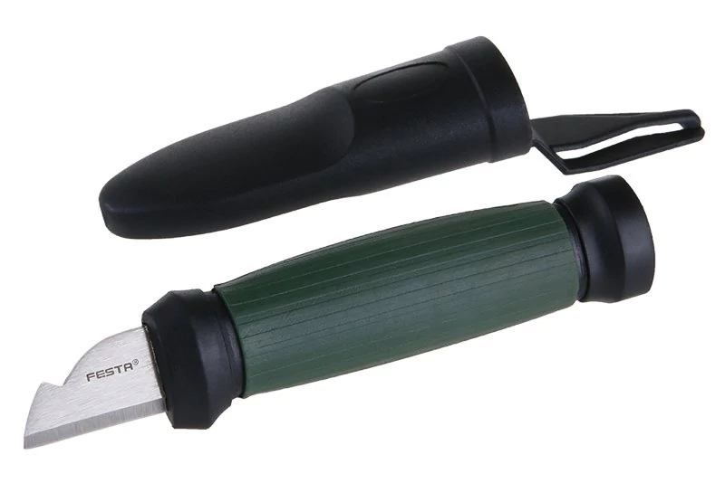 Villanyszerelő kés a kábelek csupaszításához. Speciálisan kialakított penge 2 éllel. Zöld fogantyú színe. Egyedi övrögzítő rendszerrel ellátott tok. Edzett penge 33 mm hosszú és 1,5 mm vastag. Súlya 0,109 kg.