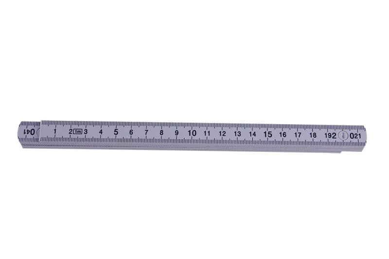Műanyag colstok fehér színben, kétoldalas milliméteres beosztással, jól olvasható fekete nyomattal. Az elemek 90°-os pozícióban rögzíthetők.