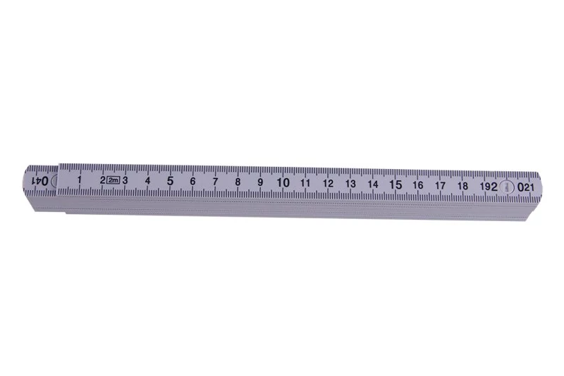 Műanyag colstok fehér színben, kétoldalas milliméteres beosztással, jól olvasható fekete nyomattal. Az elemek 90°-os pozícióban rögzíthetők.