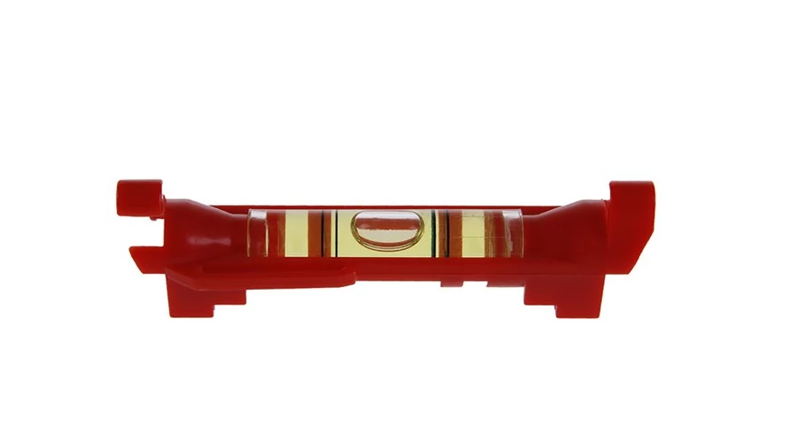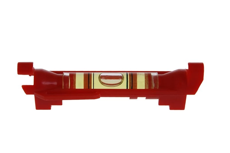 Kis műanyag vízmérték, két horoggal a madzagra akasztáshoz, extra könnyű kivitel a megereszkedés megakadályozására. Övcsipesz, zsebre. V-horony kerek csövek vízszintes helyzetének mérésére.