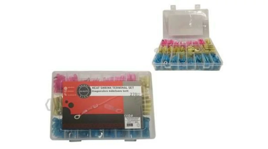 270 darabos hőre zsugorodó kábelsaru készlet. Szemes sarut, villás sarut, toldó hüvelyt tartalmaz a több rekeszes műanyag doboz különböző méretekben. A legsűrűbben használatos méretek lettek összeválogatva ebben a dobozban.
